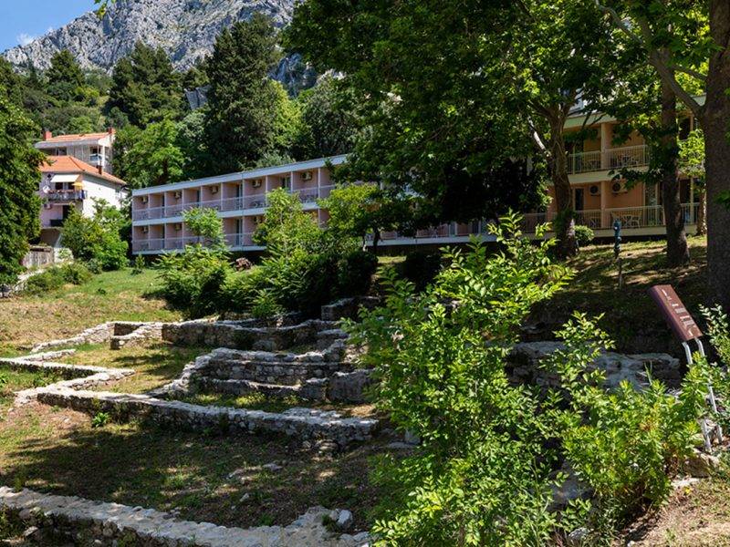 Hotel je paviljonskog tipa s centralnim restoranom i terasom, okružen stoljetnom borovom šumom uz samu šljunkovitu plažu. Od centra grada Omiša, dijeli ga gradska šetnica u dužini 800 metara pa se može smatrati gradskim hotelom, kućni ljubimci dopušteni uz doplatu 15 €– plaćanje na lisu mjesta, parking se plaćaza parking od 01.06.-15.06. 3 € po danu, 15.06.-15.09.. 5 € po danu,15.09.-30.09. 3 € po danu; 2 x tjedno je organizirana glazba uživo